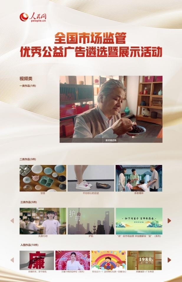 人民網(wǎng)北京12月17日電 (記者許維娜)公益廣告是弘揚(yáng)社會(huì)主義核心價(jià)值觀的重要載體,也是促進(jìn)市場監(jiān)管文化建設(shè)的重要力量。15日下午,全國市場監(jiān)管優(yōu)秀公益廣告遴選暨展示活動(dòng)評(píng)審結(jié)果在北京揭曉。此次活動(dòng)共評(píng)選出視頻類和平面類入選作品各19件,其中一類作品各有1件,二類作品各有3件,三類作品各有5件,入圍作品各有10件。