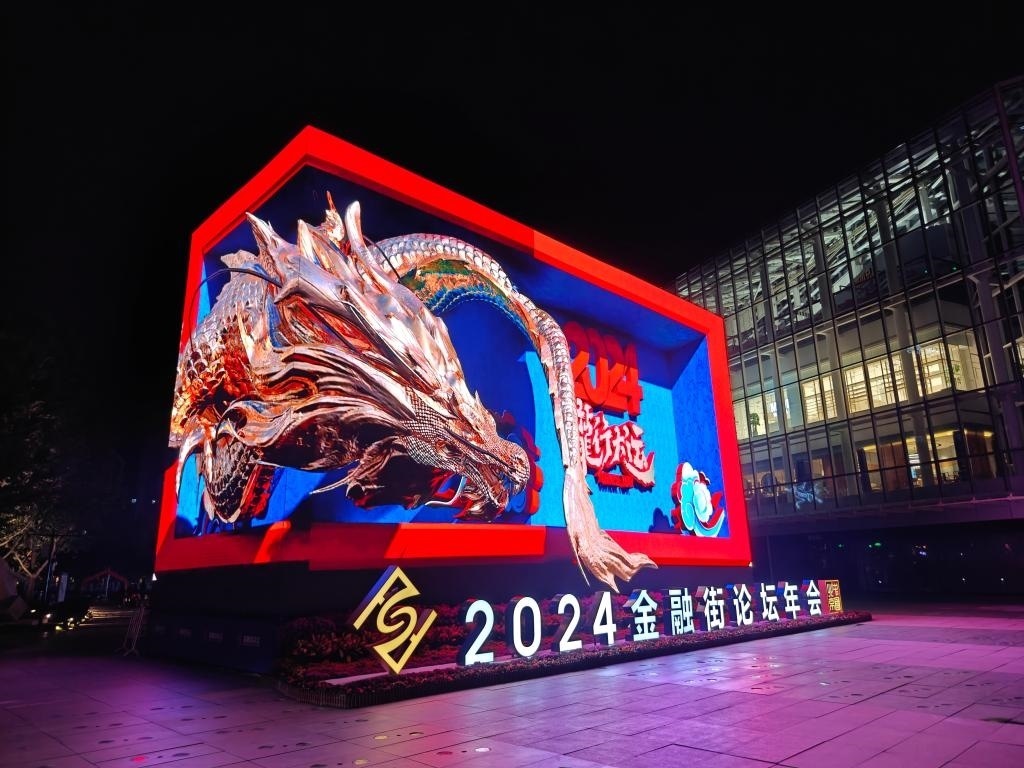 2024金融街論壇年會(huì)的會(huì)場(chǎng)外設(shè)置展示大屏。新華社發(fā)