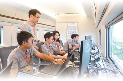CR450青年團(tuán)隊成員在試驗列車上研討技術(shù)細(xì)節(jié)。