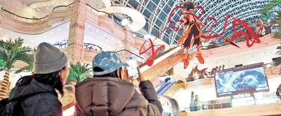 在成都高新區(qū)環(huán)球中心,市民拍攝“哪吒”形象留念。