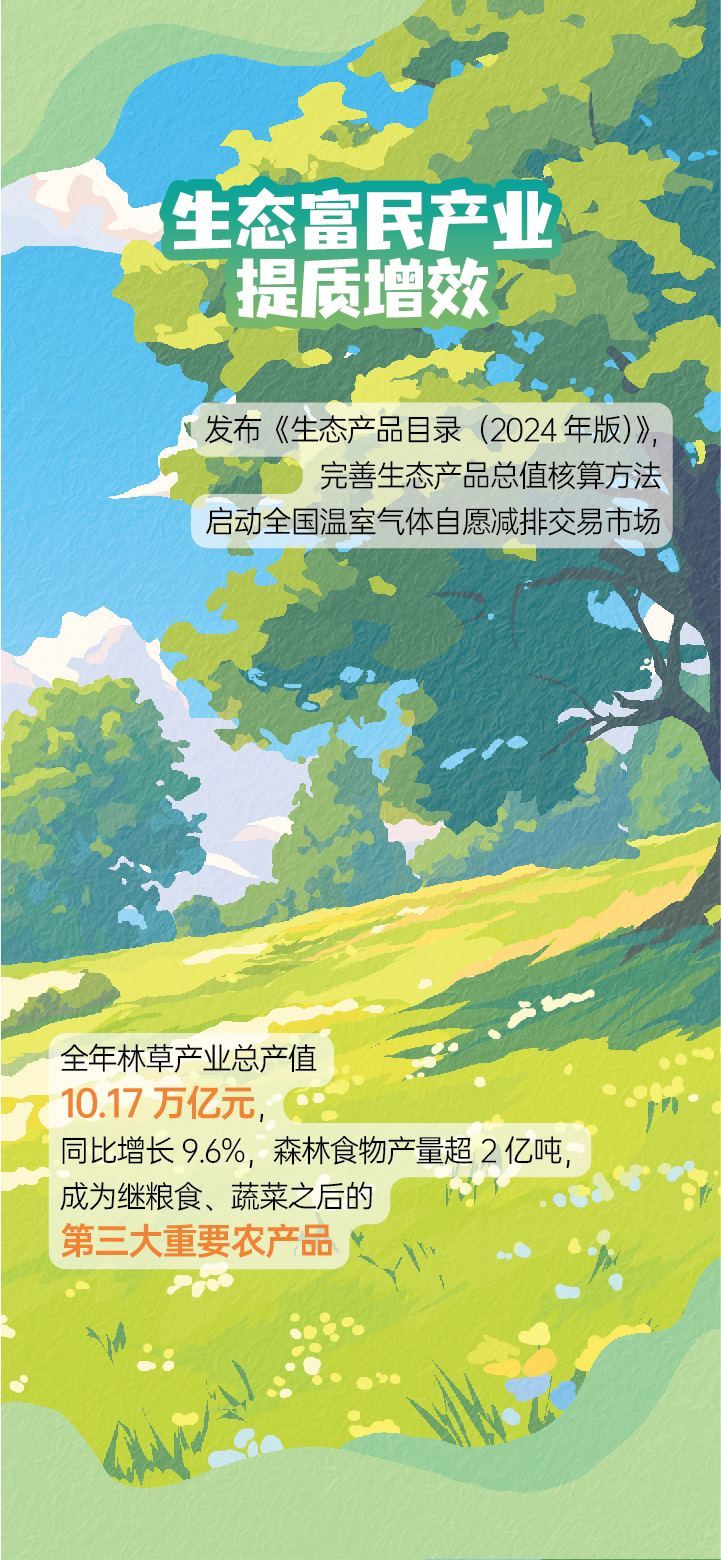 “我們持續(xù)深化改革,推進(jìn)生態(tài)富民產(chǎn)業(yè)提質(zhì)增效?!睆埨髡f,全年林草產(chǎn)業(yè)總產(chǎn)值10.17萬億元,同比增長9.6%,森林食物產(chǎn)量超2億噸,成為繼糧食、蔬菜之后的第三大重要農(nóng)產(chǎn)品。
