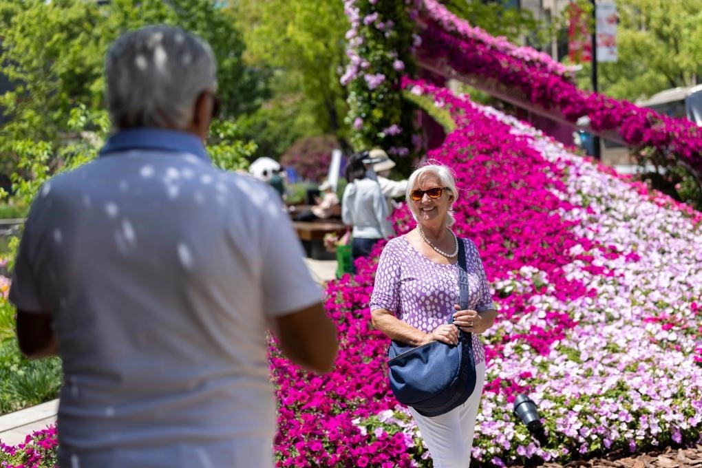 4月18日,外國游客在上海國際花展黃浦新天地主會(huì)場(chǎng)留影。新華社記者王翔 攝