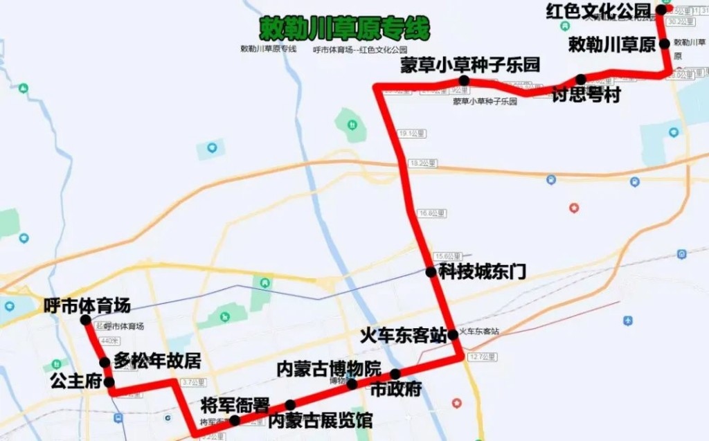 敕勒川草原專線(呼市體育場——紅色文化公園)途經(jīng):氣象局西巷、海拉爾西街、呼倫南路、新華大街、新華東街、科爾沁北路輔道、呼和塔拉西街、呼和塔拉東街、野馬圖、Y371。沿途設(shè)站:呼市體育場、多松年故居、公主府、將軍衙署、內(nèi)蒙古展覽館、內(nèi)蒙古博物院、市政府、火車東客站、科技城東門、蒙草小草種子樂園、討思號村、敕勒川草原、紅色文化公園,單程:30.5公里,配車:8—10臺。