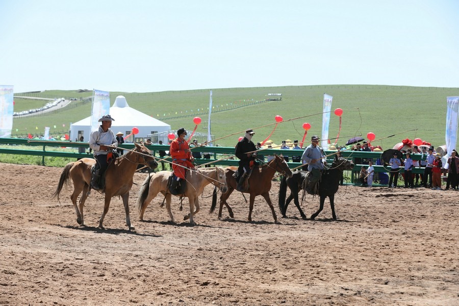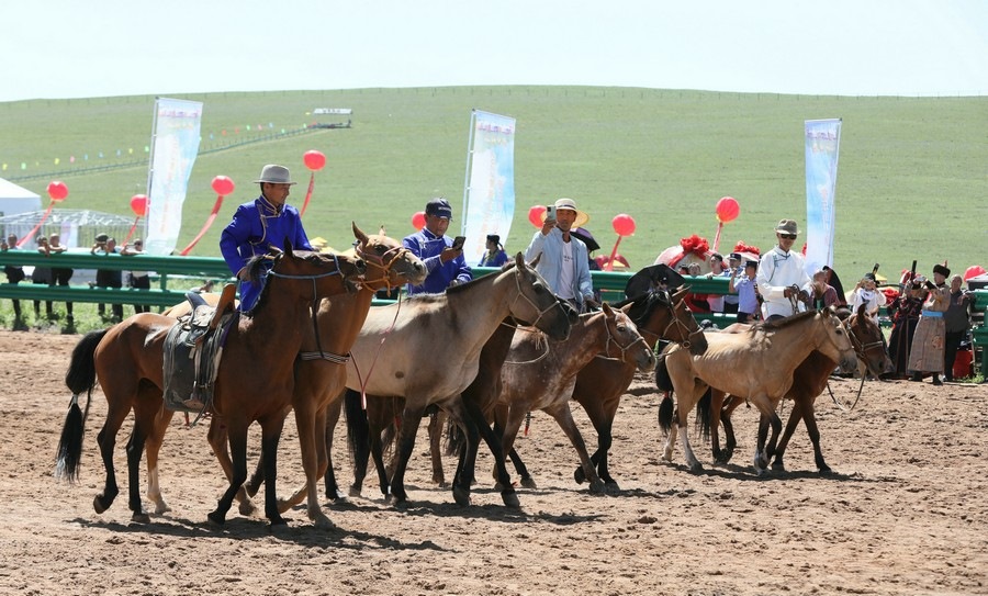 文藝演出結(jié)束后,進(jìn)行了傳統(tǒng)的那達(dá)慕賽事項(xiàng)目。賽馬場上群馬奔騰、塵土飛揚(yáng),場面蔚為壯觀,騎手們揚(yáng)鞭策馬,展現(xiàn)出精湛的騎術(shù),贏得觀眾陣陣歡呼。摔跤場上,搏克手你來我往互不相讓,斗智斗勇……
