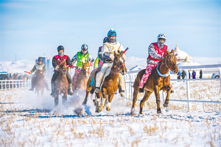 1月18日,錫林浩特市那達(dá)慕風(fēng)情園內(nèi)馬蹄踏雪、人聲鼎沸,“歌游內(nèi)蒙古·暢享錫林浩特”——冬季那達(dá)慕暨蒙古馬超級聯(lián)賽在歡騰的歌聲中拉開序幕。開幕式上,隨著馬蹄的噠噠聲,一支雄壯的馬隊踏雪而來,騎手們身著艷麗的蒙古袍,駕馭著矯健的蒙古馬,以整齊的隊列自遠(yuǎn)處緩緩走來。歌聲悠揚(yáng),舞姿豪邁,演員們以動人的演繹,完美詮釋了力量與藝術(shù)之美。本次賽事包含15公里耐力賽、10公里3人團(tuán)體接力賽、跑馬射箭、跑馬拾哈達(dá)、6公里走馬及搏克比賽等比賽項目。賽場上,騎手們馭馬飛馳,人與馬默契配合,在銀裝素裹的雪原上縱橫馳騁。在跑馬射箭與跑馬拾哈達(dá)項目上,騎手在飛奔的馬匹上挽弓搭箭、俯身拾物,動作行云流水,精湛技藝引來觀眾陣陣驚呼與贊嘆。除了扣人心弦的比賽,本次活動還為游客打造了豐富的冰雪互動體驗。冰雪涮肉宴香氣四溢,草原篝火電音派對將熱情推向高潮,千人雪戰(zhàn)、雪地拔河等趣味項目讓游客親身參與,盡情享受冰雪樂趣。現(xiàn)場還同步舉辦了錫林浩特“伊德喜”草原冬儲肉展銷活動,讓游客在觀賽之余,還能選購到正宗錫林郭勒牛羊肉,體驗純正的草原風(fēng)味。(記者