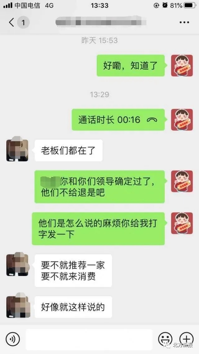 高先生提供給記者的一份微信聊天記錄顯示,當(dāng)高先生提出退還押金的要求時(shí),白泉山莊海世盛宴的工作人員告知,要不就推薦其他人到這里舉辦婚禮,要不就來(lái)這里消費(fèi)以抵消押金??傊航鹗遣荒芡说?。