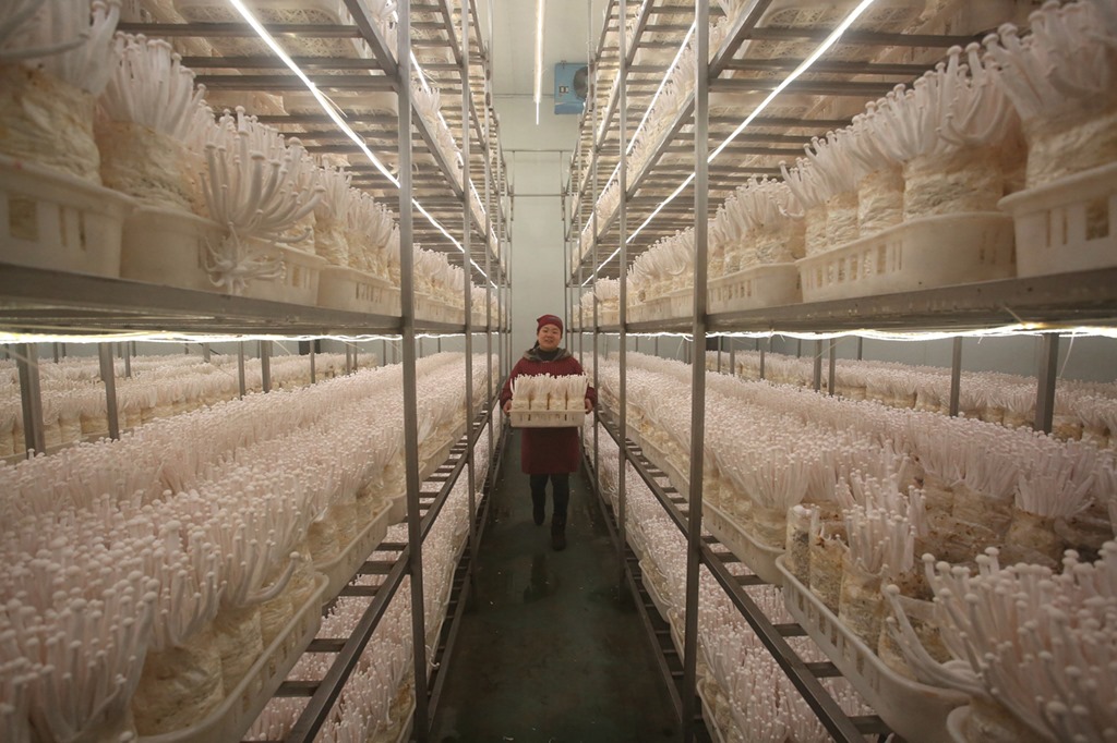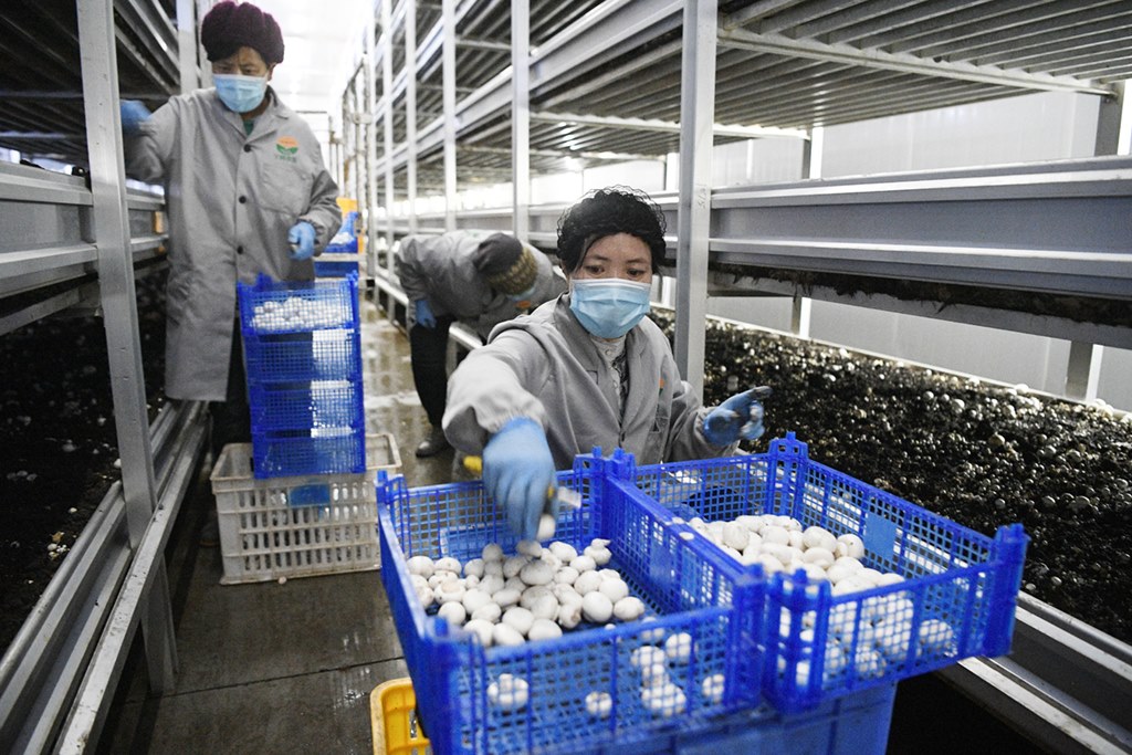 農(nóng)民在寧夏閩寧鎮(zhèn)雙孢菇栽培示范基地采摘蘑菇(2020年3月18日攝)。 新華社記者 王鵬 攝