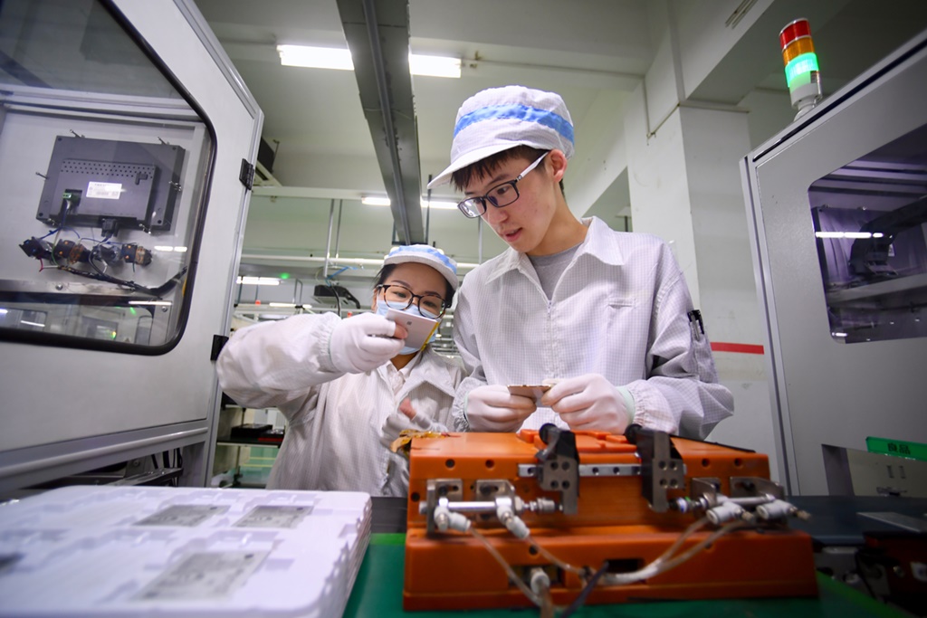 福建省飛毛腿高級(jí)技工學(xué)校三年級(jí)寧夏籍學(xué)生海鵬(右)在飛毛腿(福建)電子有限公司車間實(shí)習(xí)(2021年3月4日攝)。