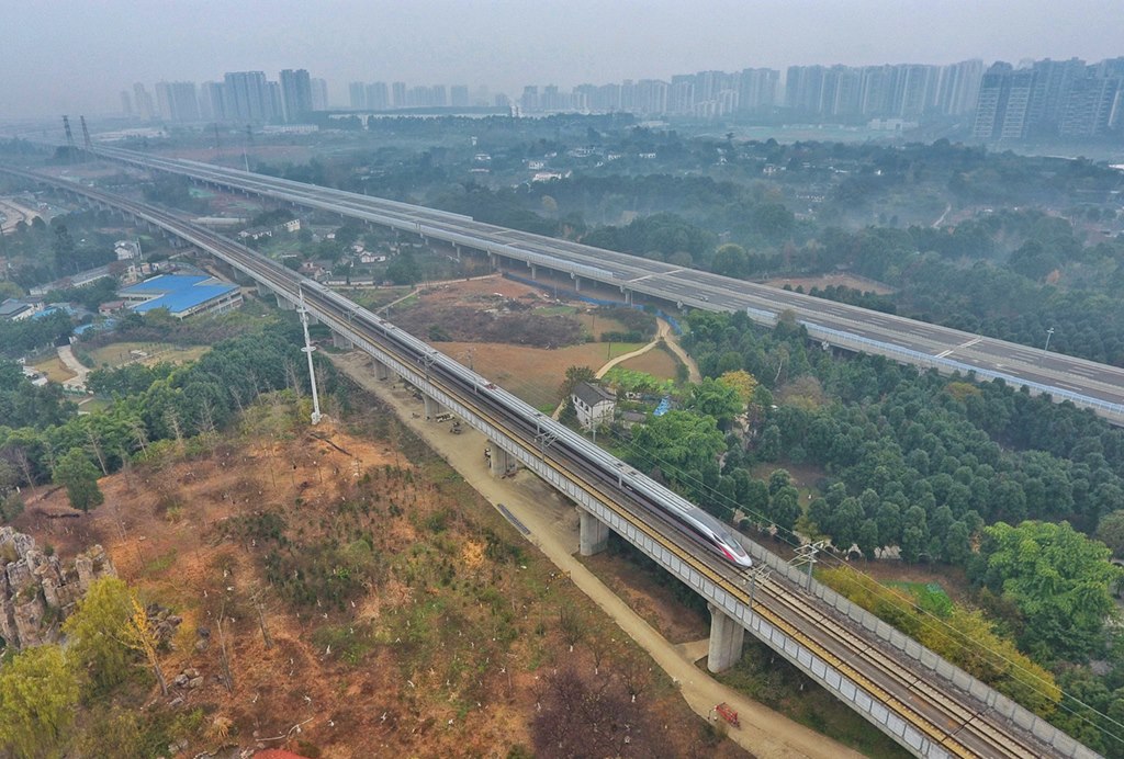 2020年12月24日,“復(fù)興號(hào)CR400AF動(dòng)車組”首次在成渝地區(qū)投入運(yùn)營,自此兩地間的高鐵通達(dá)時(shí)間縮短至62分鐘,實(shí)現(xiàn)成渝間高鐵公交化運(yùn)營1小時(shí)通達(dá)。成渝高鐵是我國“八縱八橫”高鐵主通道沿江通道的重要組成部分,是成渝地區(qū)雙城經(jīng)濟(jì)圈城際鐵路網(wǎng)的主骨架。新華社記者 劉坤 攝