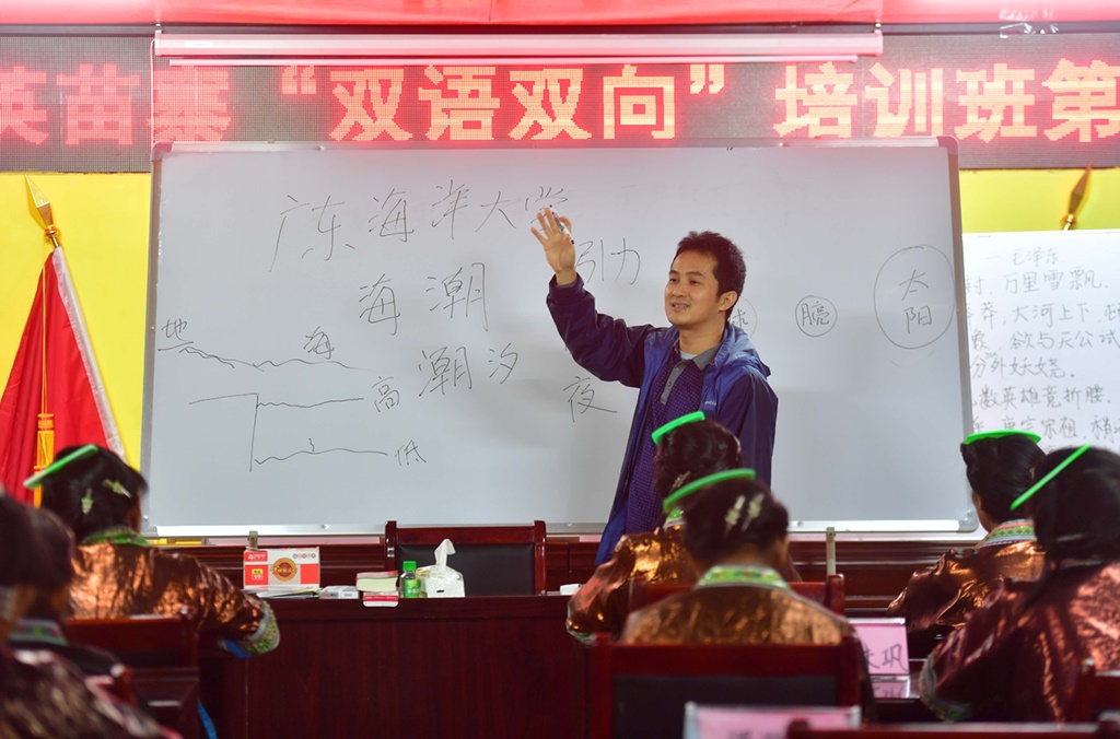 在廣西融水苗族自治縣桿洞鄉(xiāng)黨鳩村烏英苗寨,廣東海洋大學(xué)教授陳濤在給夜校班的婦女們上課(2020年10月16日攝)。新華社記者 黃孝邦 攝