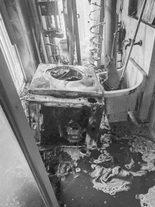 經(jīng)了解,起火點(diǎn)位于業(yè)主家的北陽(yáng)臺(tái),業(yè)主將吹風(fēng)機(jī)開(kāi)機(jī)對(duì)著陽(yáng)臺(tái)水管吹了整整一夜,該吹風(fēng)機(jī)發(fā)生故障著火后引燃了堆積的雜物,洗衣機(jī)被燒得只剩下骨架,玻璃窗戶(hù)受熱后完全破碎,雜物悉數(shù)被燒,水管、墻面也被熏黑。