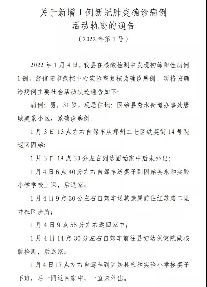 據(jù)固始縣委宣傳部微信公眾號消息,1月4日,河南固始縣在核酸檢測中發(fā)現(xiàn)初篩陽性病例1例,經(jīng)信陽市疾控中心實驗室復(fù)核為確診病例。