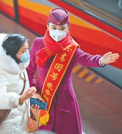 春運(yùn)首日,成渝高鐵“復(fù)興號(hào)”智能動(dòng)車組“共青團(tuán)號(hào)”列車首發(fā),這是全國(guó)首次在“復(fù)興號(hào)”智能動(dòng)車組中常態(tài)化開(kāi)行“共青團(tuán)號(hào)”列車,列車將開(kāi)展常態(tài)化志愿服務(wù)。圖為志愿者服務(wù)旅客乘車。