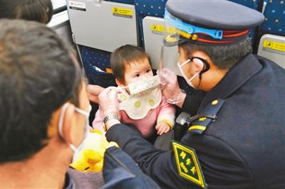 南昌客運(yùn)段“井岡山號(hào)”列車乘務(wù)人員積極開(kāi)展“暖心春運(yùn)”行動(dòng),通過(guò)貼喜慶窗花、贈(zèng)小旅客愛(ài)心手環(huán)和卡通口罩等一系列溫馨舉措,把溫暖送到旅客身邊。圖為乘務(wù)人員為小旅客贈(zèng)送愛(ài)心口罩。