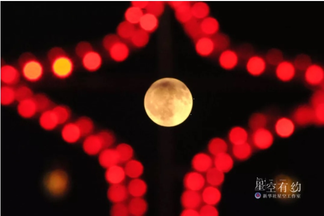 這是2013年2月24日元宵節(jié),北京夜空的月亮與五彩繽紛的燈飾相映成輝。這一年的元宵月是“十七圓”。(新華社記者何俊昌攝)