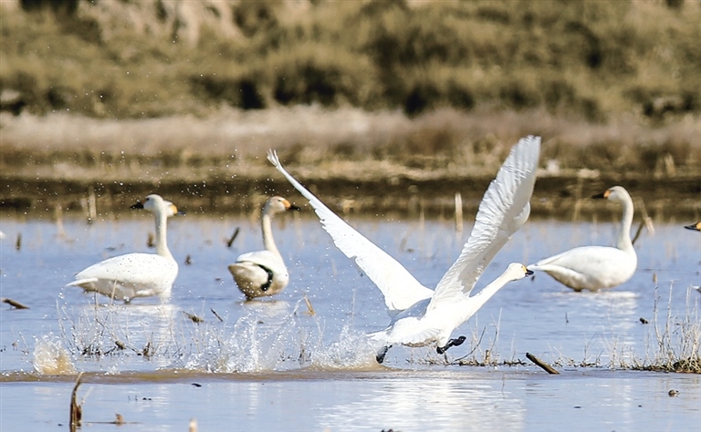 托克托縣黃河濕地管護中心副主任王曉東接受記者采訪時表示,黃河流經托克托縣37.5公里、9個自然村。隨著近年來對黃河流域生態(tài)環(huán)境保護力度的加大,每年都會吸引大批鳥類來托克托縣“做客”,其中尤以天鵝最受關注。天鵝屬于國家二級保護鳥類,每年從2月底3月初開始,就會成群結隊來黃河流域一帶停歇、棲息、覓食,補充能量后,再繼續(xù)飛行,最多的時候有上萬只。(記者 張巧珍 牛天甲)