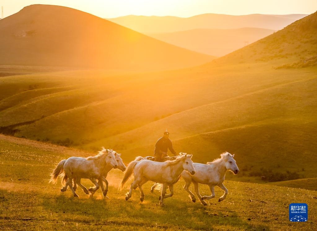 5月17日,錫林郭勒盟西烏珠穆沁旗的牧民在夕陽(yáng)下馴馬。