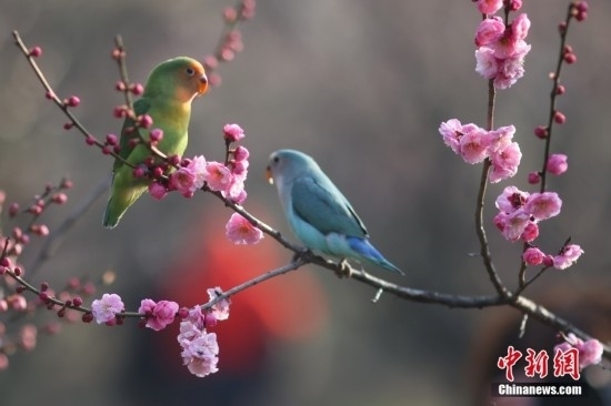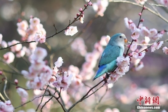 2月20日,江蘇南京,牡丹鸚鵡在梅花山梅花樹上“賞”梅。牡丹鸚鵡由南京一市民飼養(yǎng),每年在梅花盛開的時(shí)候,他都會(huì)帶著鸚鵡來(lái)到這里“賞”梅,同時(shí)也成為一景。中新社記者 泱波 攝