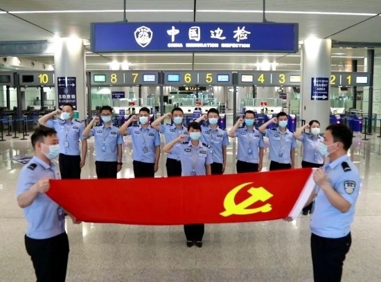 圖為孫偉帶領(lǐng)執(zhí)勤隊(duì)黨員移民管理警察開展重溫入黨誓詞活動(dòng)。