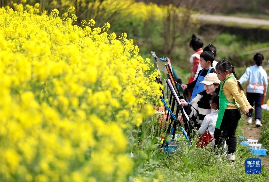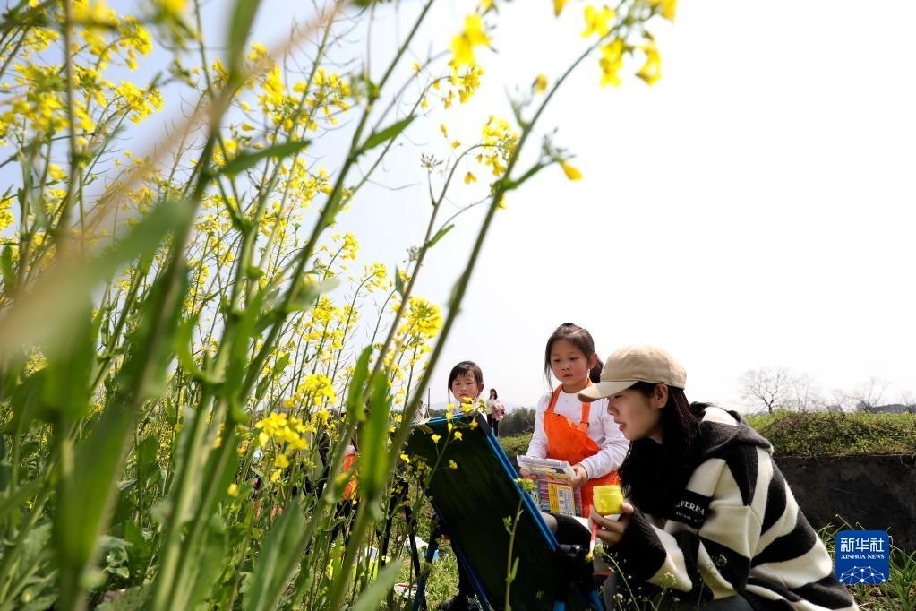 2月28日,在湖南省資興市唐洞街道高碼村,老師指導小朋友在油菜花田旁畫畫。