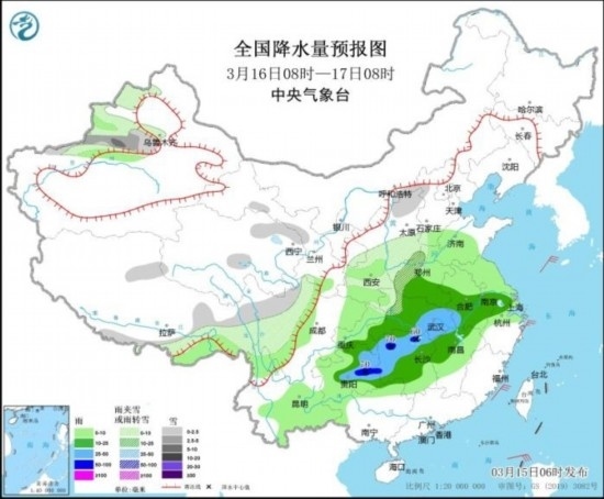 3月16日08時(shí)至17日08時(shí),新疆沿天山地區(qū)、西藏東部、山西北部、川西高原北部等地部分地區(qū)有小到中雪。黃淮西部、江淮西部和南部、江漢大部、江南北部和西部、西南地區(qū)東南部等地部分地區(qū)有中到大雨,其中,湖南北部和西部、貴州中東部等地部分地區(qū)有暴雨(50~70毫米),并伴有短時(shí)雷暴大風(fēng)、冰雹等強(qiáng)對(duì)流天氣。