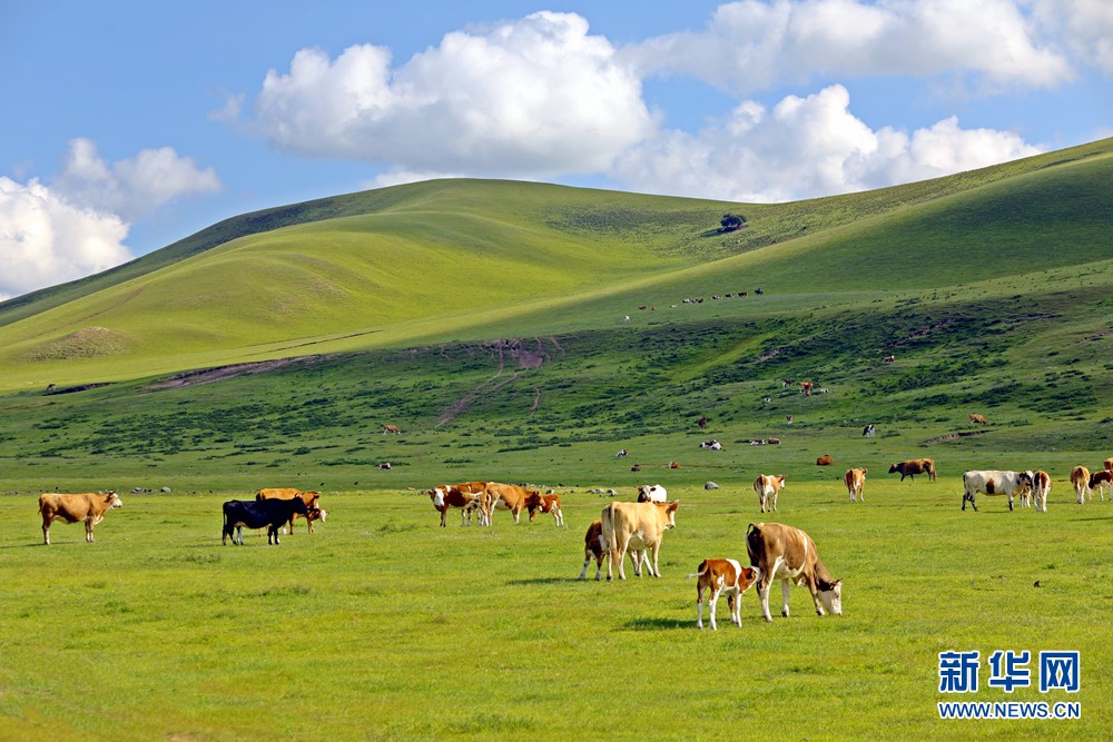 牛群在美麗的扎魯特草原上悠然吃草踱步。新華網(wǎng)發(fā)(白敖敏攝)