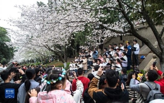 3月18日,武漢大學海燕合唱團在賞櫻現(xiàn)場演唱歌曲。