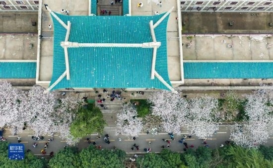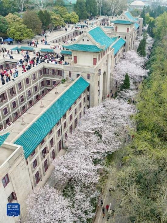 3月18日,來自各地的抗疫醫(yī)護人員及家屬在武漢大學校園賞櫻(無人機照片)。