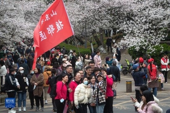當日,武漢大學舉行抗疫醫(yī)護賞櫻專場。珞珈山下,來自全國各地的1.6萬余名抗疫醫(yī)護人員及家屬赴約賞櫻。