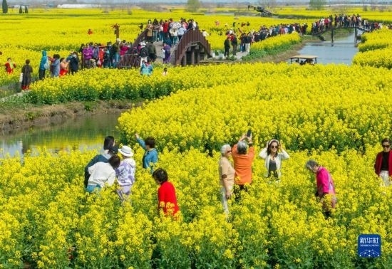 3月19日,游客在江蘇興化千垛菜花風(fēng)景區(qū)游覽(無人機照片)。
