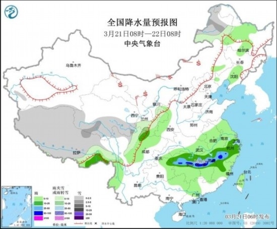 全國(guó)降水量預(yù)報(bào)圖(3月21日08時(shí)-22日08時(shí))