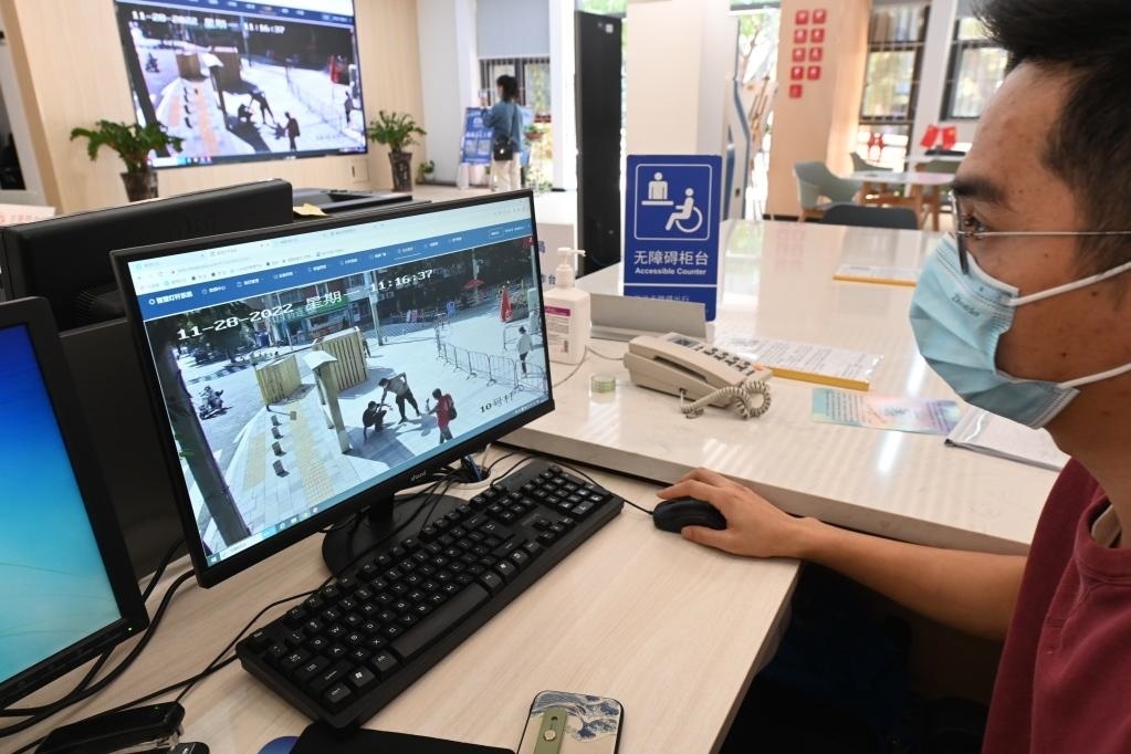 2022年11月28日,福州市福瑞社區(qū)便民服務(wù)中心社區(qū)智慧平臺可即時收到小區(qū)周邊智慧燈桿監(jiān)控拍攝到的路面情況,以及路人需要幫助的信息等。新華社記者林善傳攝