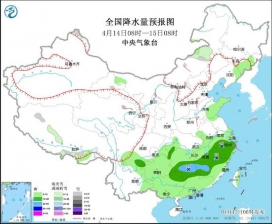 全國降水量預(yù)報(bào)圖(4月13日08時(shí)-14日08時(shí))。圖片來源:中央氣象臺(tái)網(wǎng)站