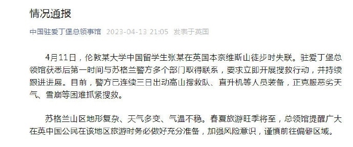 ·一名中國留學生在英國徒步時失聯(lián),中領館:已聯(lián)系警方,正抓緊搜救。
