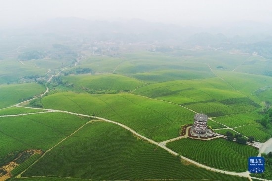 2021年4月12日拍攝的貴州省湄潭縣的“萬畝茶海”風光(無人機照片)。