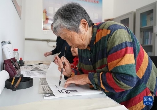 5月9日,老人在北京市平谷區(qū)西樊各莊村“養(yǎng)老驛站”練習(xí)書法。