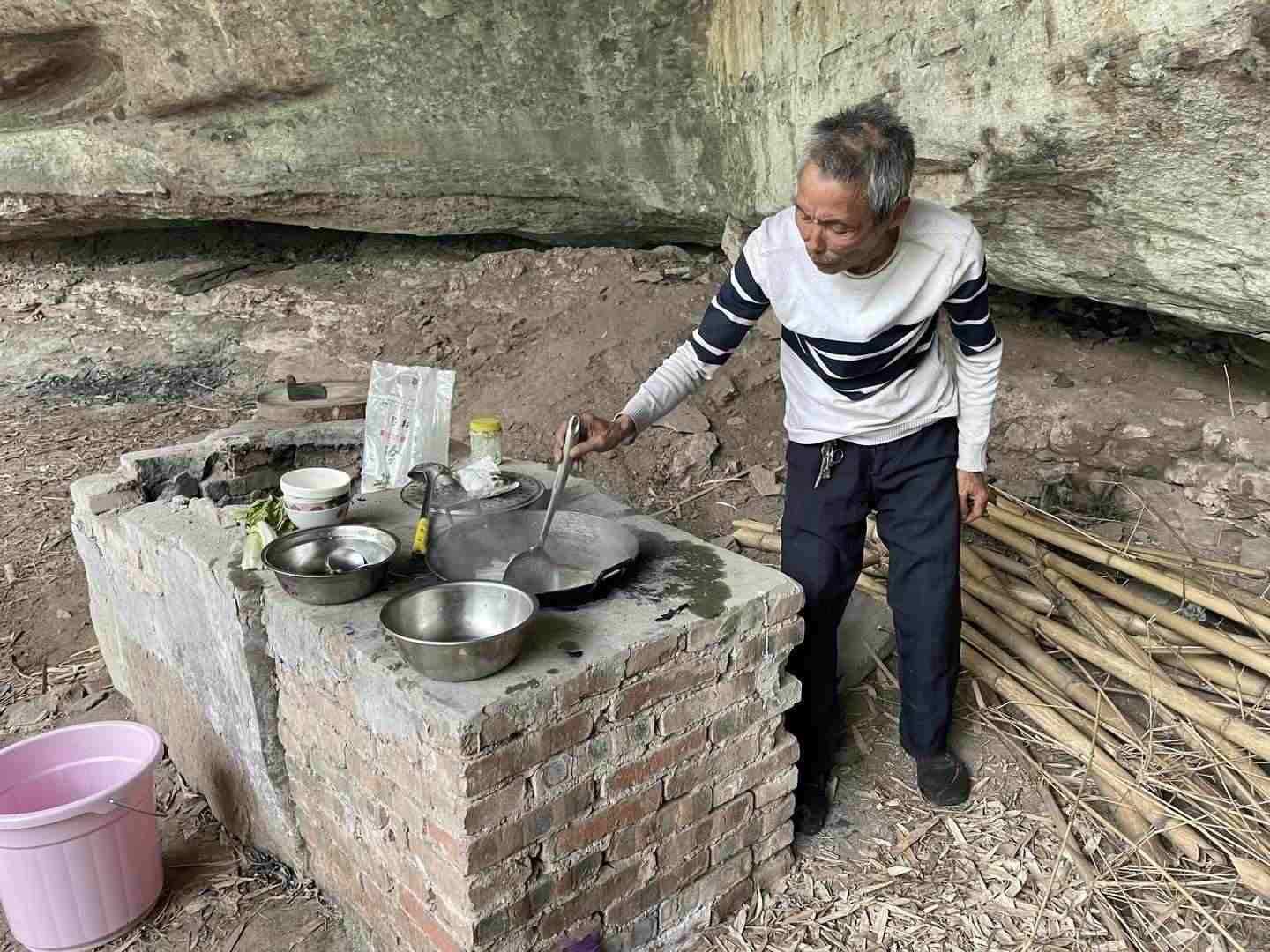 紅星新聞記者觀察發(fā)現(xiàn),巖洞里確實(shí)沒有豬油或菜油,只有小半袋米和半袋鹽。但巖洞里有灶臺。據(jù)說很久以前這個洞里住過人,但已去世幾十年;后來,還有人在洞里養(yǎng)雞,巖洞里有兩間像房子的構(gòu)筑物,但是沒有門。馮必全砍了幾根竹子搭架做床,棉被褥子則是鄉(xiāng)親們不要的物件,他去要過來的。