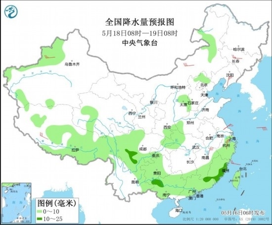 5月18日08時至19日08時,新疆沿天山地區(qū)和伊犁河谷、西藏南部和東部、川西高原、內(nèi)蒙古東北部、青海西部、山西中部、河北北部、西南地區(qū)東南部、江漢西部、江南中東部和南部、華南大部等地的部分地區(qū)有小到中雨。新疆北部、西藏南部、內(nèi)蒙古中部、吉林中部、遼東半島、江西北部、浙江北部等地的部分地區(qū)有4~6級風。