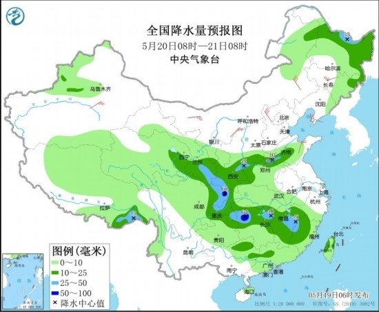 5月20日08時(shí)至21日08時(shí),內(nèi)蒙古東北部、黑龍江東部和北部、吉林東部、西藏東南部、青海東部、西北地區(qū)東部、黃淮北部、四川盆地東部、貴州東北部、江南、華南北部等地部分地區(qū)有中到大雨,其中,湖南西部、四川盆地東北部等地局地有暴雨(50~60毫米)。內(nèi)蒙古、東北地區(qū)、西北地區(qū)東部、華北等地部分地區(qū)有4~6級(jí)風(fēng)。