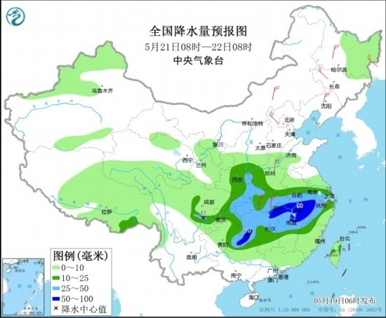 5月21日08時(shí)至22日08時(shí),陜西中部、黃淮西部、江淮西部、江漢、江南大部、西南地區(qū)東部等地部分地區(qū)有中到大雨,其中,安徽南部、湖北東南部、湖南東北部和西部、江西北部、浙江中北部、貴州東南部等地部分地區(qū)有暴雨(50~90毫米)。內(nèi)蒙古、東北地區(qū)、黃淮、江漢、江南北部等地部分地區(qū)有4~6級(jí)風(fēng)。