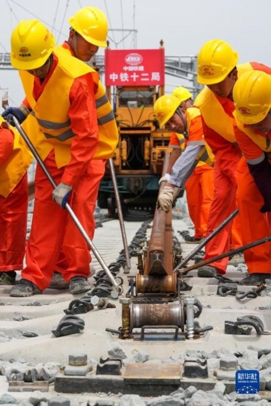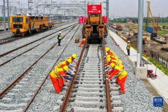 5月20日,在滬寧沿江高鐵太倉(cāng)站施工現(xiàn)場(chǎng),中鐵十二局的工程人員準(zhǔn)備進(jìn)行螺栓緊固作業(yè),將對(duì)接好的鋼軌固定。