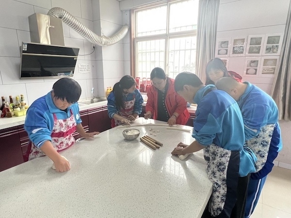 走進陜西省渭南市特殊教育學(xué)校,手鼓聲、搟面聲、冰壺與地面摩擦聲此起彼伏;由教師扮演的“超市收銀員”正為“購物”的學(xué)生結(jié)賬;“自助取款機”前,幾位小朋友正排著隊學(xué)習(xí)如何存取現(xiàn)金;醫(yī)院“問診臺”、“掛號處”等模擬窗口應(yīng)有盡有……在這里,飽含愛心、耐心、責(zé)任心的教學(xué)態(tài)度和幫助特殊兒童自理、自立、自強的教育初衷滋養(yǎng)著每一名學(xué)生平安成長。