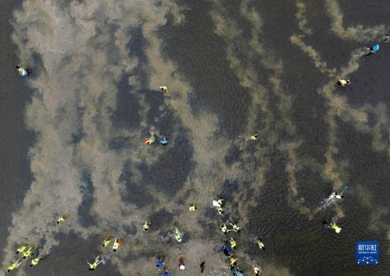5月30日,在淮安市洪澤區(qū)岔河鎮(zhèn),人們?cè)诓逖砉?jié)上參加摸魚比賽(無人機(jī)照片)。