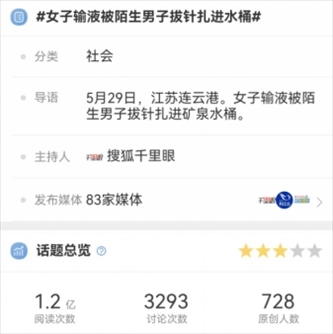據(jù)微信號(hào)“網(wǎng)信連云港”6月1日消息,近日,一條涉連云港“女子輸液被陌生男子拔針扎進(jìn)水桶”的新聞,引發(fā)多家媒體轉(zhuǎn)載報(bào)道,相關(guān)話題沖上各大平臺(tái)熱榜。