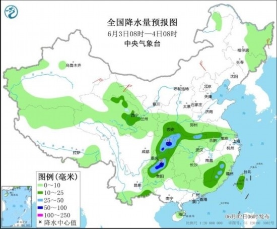 全國(guó)降水量預(yù)報(bào)圖(6月2日08時(shí)-3日08時(shí))