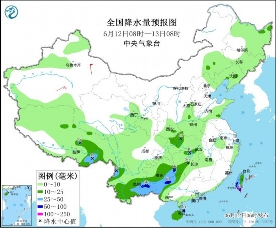 6月12日08時(shí)至13日08時(shí),貴州南部、云南東南部和西北部、廣西北部、海南島東北部、臺(tái)灣島大部、湖北中部、西藏東南部等地部分地區(qū)有中到大雨,局地暴雨或大暴雨(50~130毫米)。新疆中北部和東部、內(nèi)蒙古中部等地部分地區(qū)有4~6級(jí)風(fēng)(見(jiàn)圖2)。