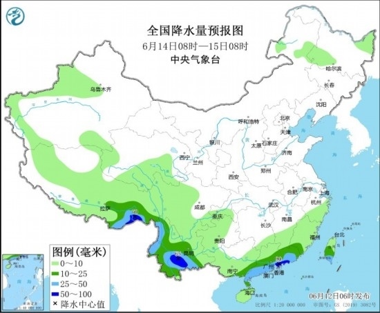 6月14日08時(shí)至15日08時(shí),云南中南部和西部、廣西南部、廣東中南部、臺(tái)灣島中南部、西藏東南部等地有大雨,局部地區(qū)有暴雨(50~90毫米)(見(jiàn)圖4)。