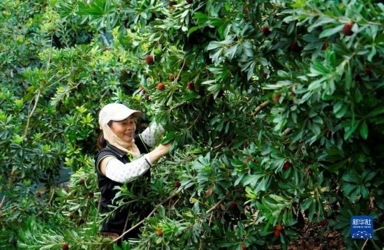 湖南省靖州苗族侗族自治縣渠陽鎮(zhèn)官團村的果農(nóng)采摘楊梅(6月18日攝)。