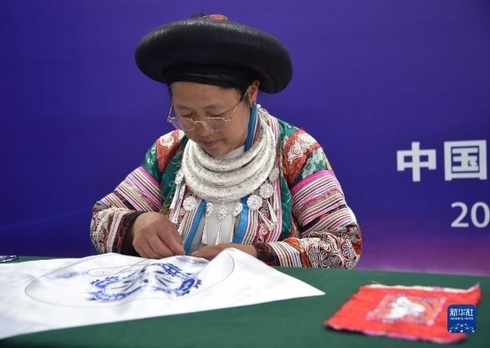 6月27日,繡娘展示苗繡技藝。