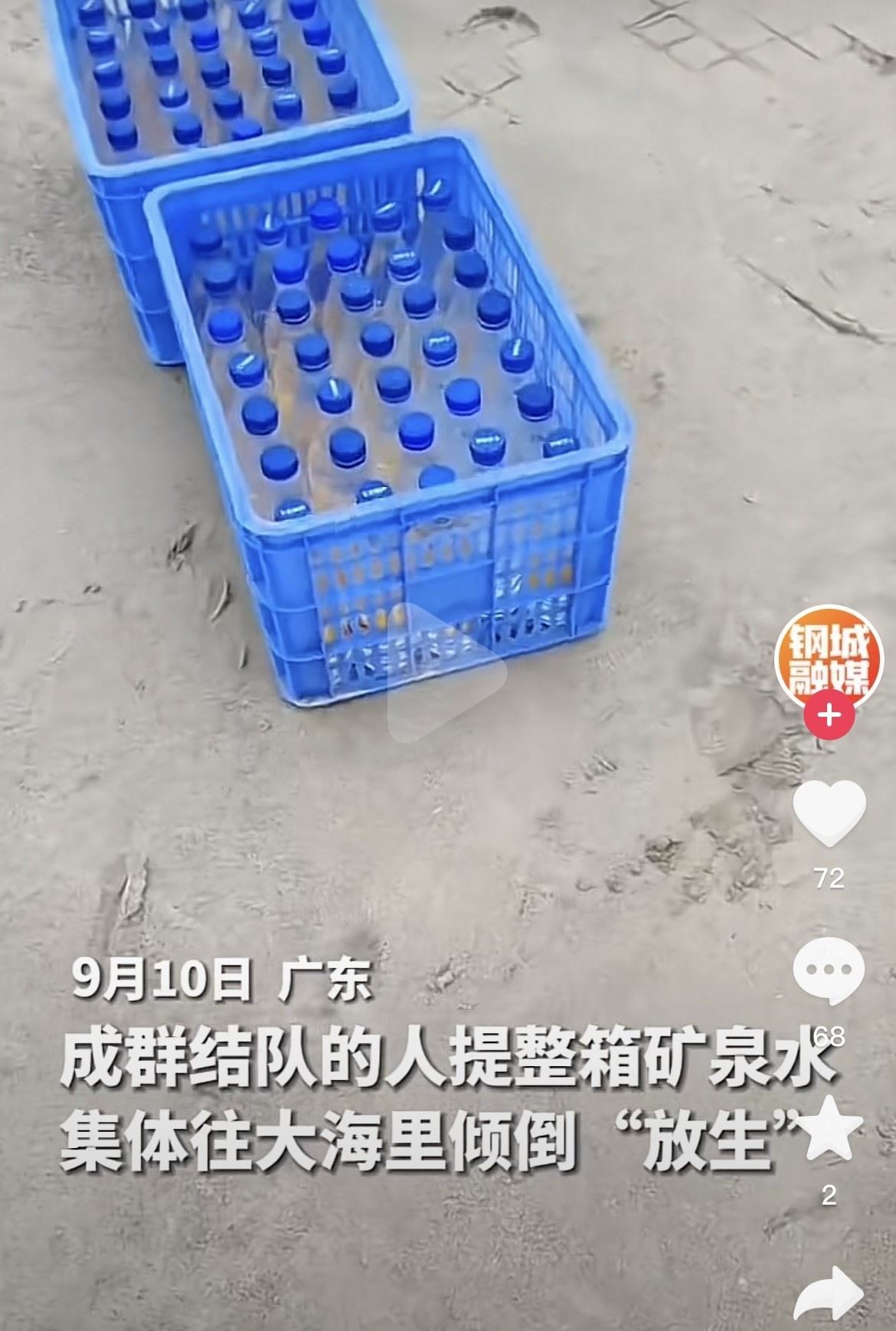 近日,有網(wǎng)友在社交平臺發(fā)布稱,廣東汕尾湖東港有一群人往海里“放生”礦泉水,60多箱礦泉水被浪費(fèi)?,F(xiàn)場視頻顯示,一群人抬著藍(lán)色的箱子正往海邊走,箱子里可見擺放整齊的礦泉水瓶。視頻發(fā)布者介紹,9月10日下午3點(diǎn)多來了兩輛大巴,大巴上坐滿了人。